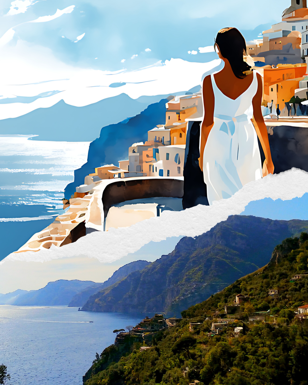 "Amalfi Vista" Watercolor Wall Art Print - Woman in White Gazing Over Coastal Villages - Italian Riviera Panorama Poster