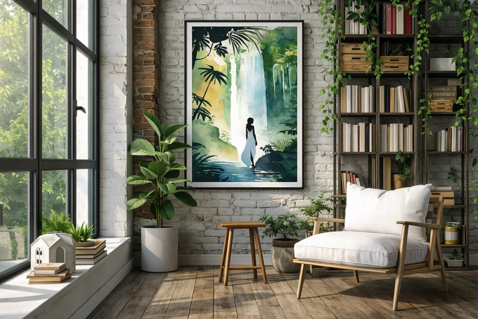 "Autumn Canyon" Watercolor Wall Art Print - Woman in White by a Canyon River in Fall - Golden Leaves Poster