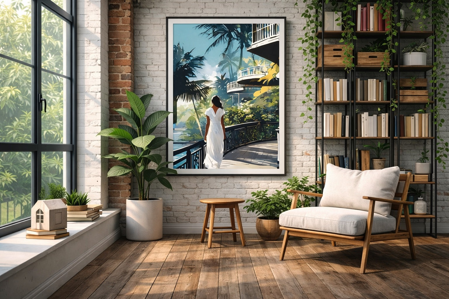 "Andaman Dreams" Watercolor Wall Art Print - Woman in White at a Thai Beach with Longtail Boats - Island Paradise Poster