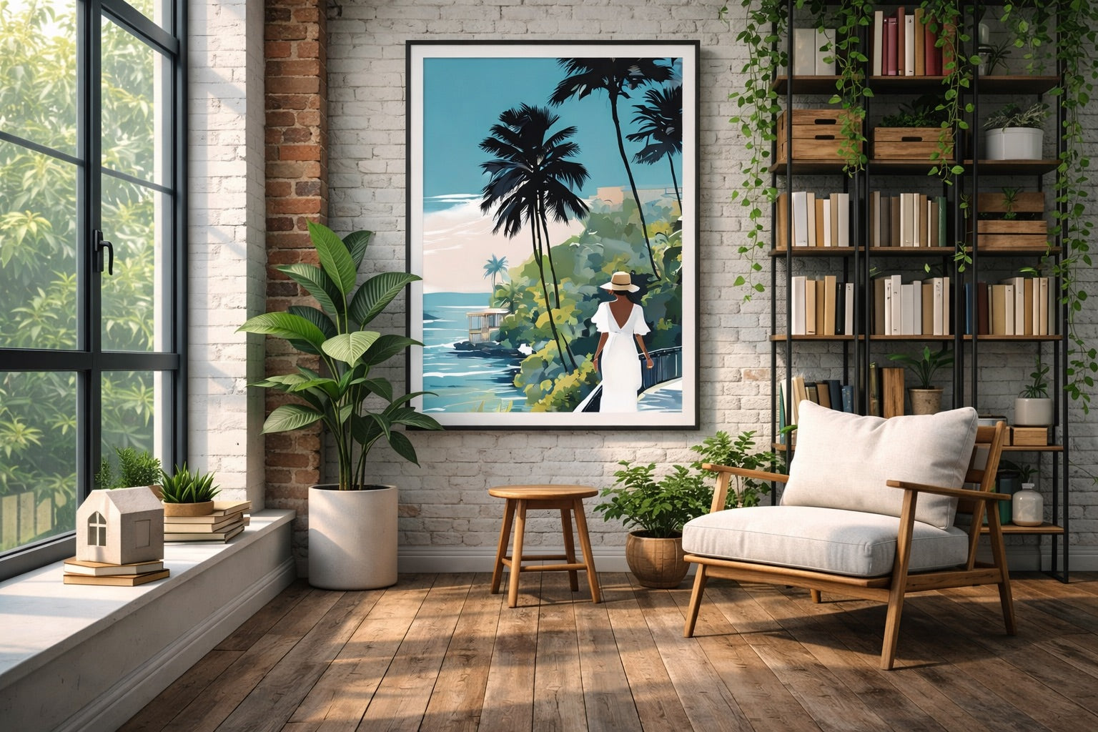 "Amber Shores" Watercolor Wall Art Print - Woman in White Walking Beach at Sunset - Tropical Evening Poster