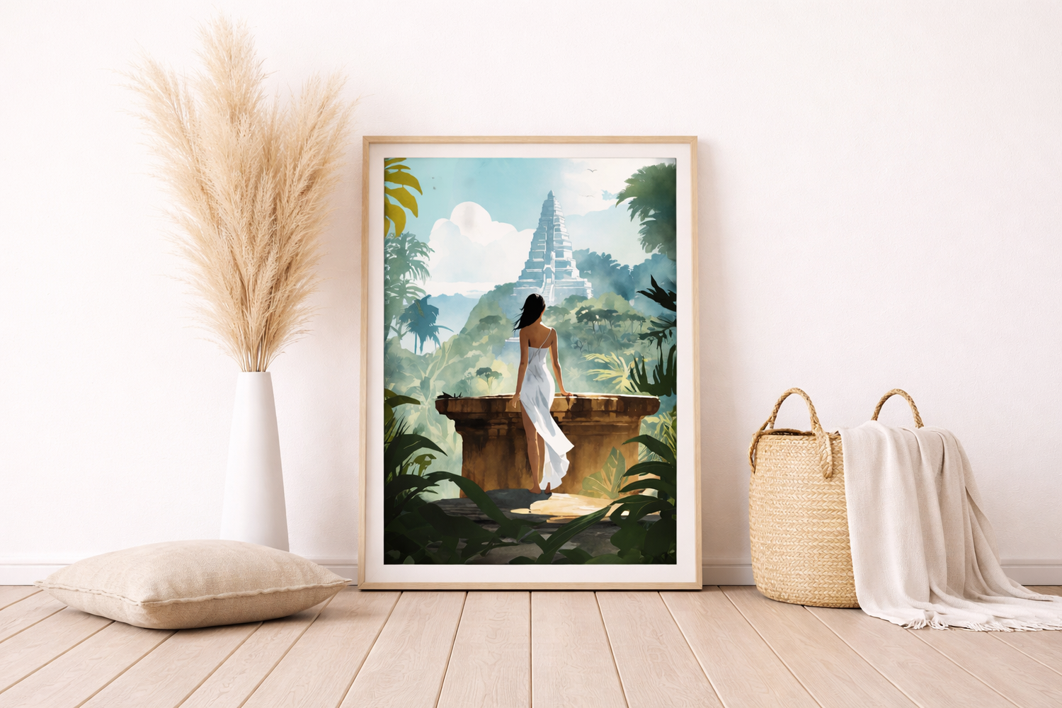 "Amalfi Dreams" Watercolor Wall Art Print - Woman in White Gazing at Mediterranean Coast - Italian Seaside Poster